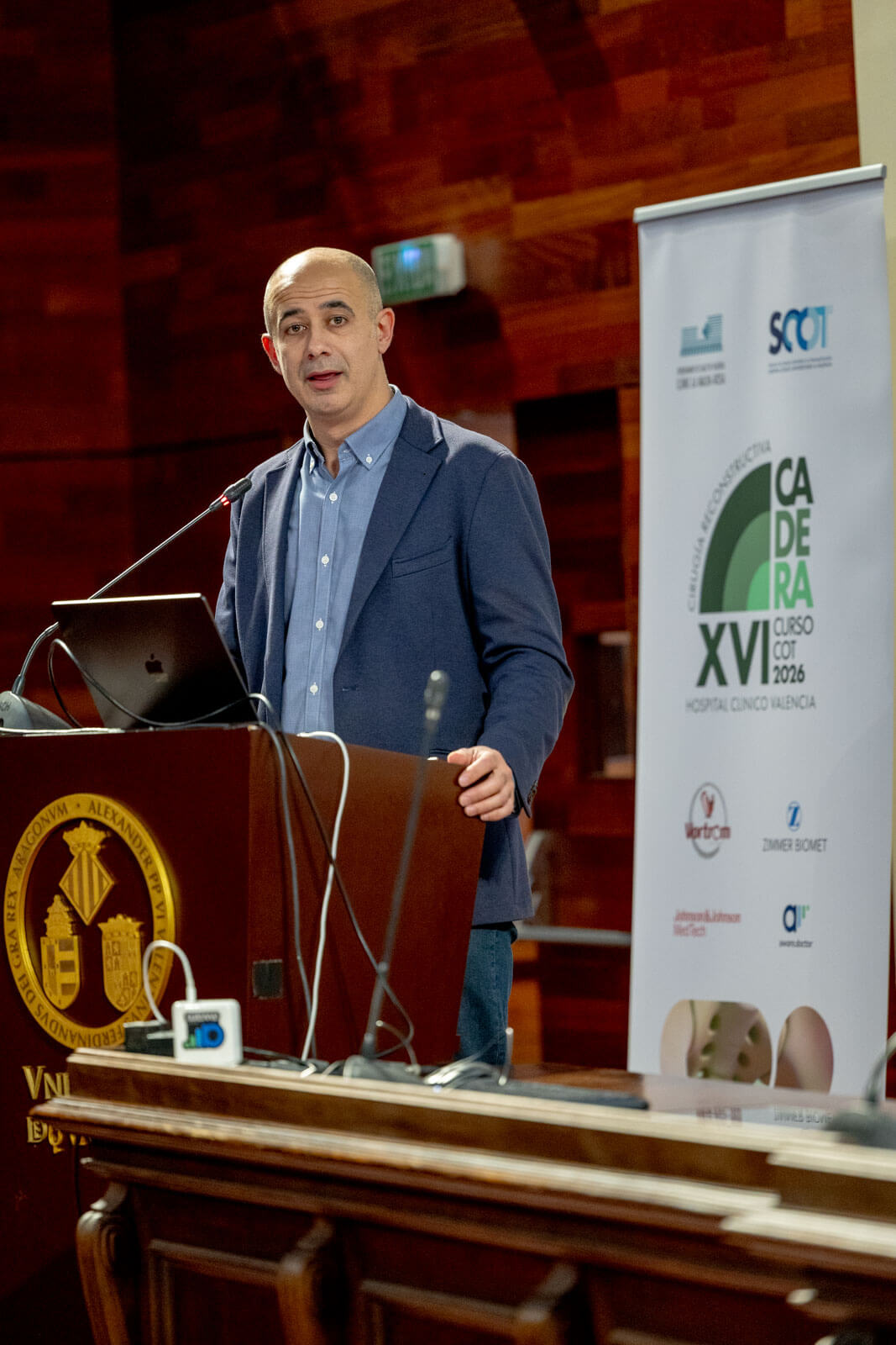 Uno de los hitos de la jornada fue la cirugía de cadera por abordaje anterior asistida por el robot ROSA, retransmitida en directo desde el quirófano del Hospital Clínico de Valencia y liderada por el jefe de servicio COT de la unidad y director de la formación el Dr. Antonio Silvestre. Los asistentes pudieron seguir en tiempo real la planificación del caso, el posicionamiento de los componentes y los principales puntos técnicos del procedimiento, comentados por especialistas durante toda la intervención. La sesión se completó con la clase magistral del Dr. José García-Rellán, que desgranó paso a paso la técnica realizada, sus claves prácticas, resultados y estudios en progreso de esta técnica asistida.